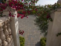 A classic California mansion in Los Angeles with a white exterior. The elevated open space offers a clear view of the spacious backyard, filled with vegetation and a brick walkway. The sunny day enhances the beauty of the bougainvillea in the foreground.