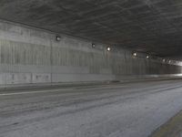 A view of an urban underpass in Los Angeles, California. The concrete tunnel and road surface are surrounded by city infrastructure. The bridge and line of buildings create a striking architectural composition.
