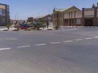 A clear day in Luderitz, South Africa. The urban design showcases the city's vibrant restaurant and cafe scene. Streets lined with buildings and houses lead to tarred thoroughfares, surrounded by vegetation and trees.