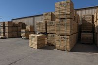 A well-organized lumberyard with a variety of wood products neatly stacked on pallets and ready for retail. The sunny day and clear sky create the perfect backdrop for this bustling construction hub.