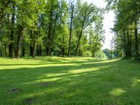A lush green park with open spaces and tall trees providing shade. The sunlight filters through the leaves creating a beautiful play of light and shadows. A perfect place to enjoy a sunny day in nature.
