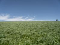 This stock photo captures a beautiful landscape in rural Germany. The image shows a vast open space with a clear sky and lush green grass surface. The field, surrounded by nature, is ideal for agriculture and offers a serene and peaceful atmosphere. Perfect for illustrating the charm of the European countryside.