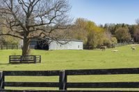 A lush green landscape in rural Ontario, Canada. The farm is surrounded by a split-rail fence and Armco barrier. Trees and vegetation provide shade and add to the picturesque scenery. A peaceful day in the countryside.