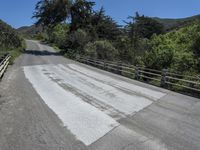 This is an image of a coastal road in California, USA. The road curves along the coastline, with lush green vegetation and trees lining the thoroughfare. The clear sky above contrasts with the blue ocean in the distance. The road is made of concrete and is separated from the street by a wooden fence. The image depicts the natural beauty of the California landscape and showcases the infrastructure of the road and the nonbuilding structures like the Armco barrier. This photo captures a sunny day in California.