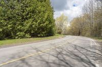 This stock photo features a captivating view of a picturesque landscape in Ontario, Canada. A wide road with an empty white and yellow curb winds through lush vegetation, surrounded by tall trees and vibrant green grass. The road surface, made of smooth asphalt, seamlessly blends into the natural surroundings. The branches of the trees cast enchanting shadows, creating a sense of tranquility and serenity. This scenic drive is the perfect escape into nature, with the vibrant blue sky and fluffy clouds adding to the beauty of the day. Whether it's a leisurely drive or a scenic journey, this road provides an idyllic entry into the captivating natural beauty of Ontario, Canada.