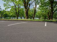 A lush green landscape surrounding a serene lake. Trees provide shade along the road, creating a picturesque view. The park offers a recreational space with a smooth asphalt surface for walking and biking.