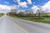the empty road next to an pasture with a horse and a house on the right