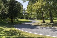 A scenic road in New Zealand's South Island, lined with lush greenery and towering trees. The clear sky adds to the picturesque landscape, making it a perfect day for outdoor recreation in a public park or stadium.