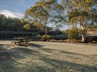 A lush green landscape with open spaces and a variety of vegetation. The park offers shade with trees and outdoor benches for recreation. The grass surface creates a perfect spot for outdoor activities in nature.