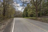 A scenic landscape in Ontario, Canada. The lush green vegetation and trees lining the asphalt road create a beautiful natural setting. Clouds fill the sky, adding depth to the scene. A serene day in Toronto.