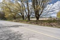 a paved road on a sunny day with no vehicles in sight as far as the trees are