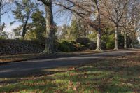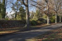 A picturesque landscape showcasing a road surrounded by lush vegetation and towering trees. Sunlight filters through the branches, illuminating the road surface. A perfect day to explore the beauty of nature.