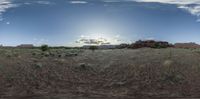 an image of a panorama fish eye lens at sunset on a cloudy day in the desert