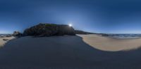 A majestic rock formation stands tall on a sandy beach in Portugal. The setting sun casts a warm glow, creating a serene atmosphere. The clear sky and azure ocean complete the picturesque coastal landscape.