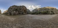 Aerial view of Majorca's coastal landscape in Spain. Rocky walls meet gravel terrain, with open spaces and clear skies. Nature's beauty with hard shadows create a picturesque European scene.