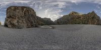 A scenic coastal landscape in Majorca, Spain. The rock walls of the canyon contrast against the clear sky. Gravel and dirt surfaces lead to an open space with a view of the ocean. Nature at its best in the Balearic Islands.