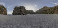 A coastal landscape in Majorca, Spain, featuring a rock wall casting a hard shadow under a clear sky. Gravel and dirt areas contrast with the open space of the Balearic Islands.