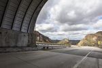 A stunning view of the iconic Malibu Bridge in California, USA. The bridge stands tall against the backdrop of the picturesque mountains and open spaces. The unique fish-eye lens captures the architecture in a three-dimensional perspective.