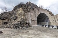 Construction of a large open tunnel in Malibu, California. The tunnel cuts through the mountain state park area, offering a captivating view. Clouds dot the clear blue sky above the asphalt road.