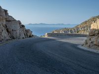 This is an image captured in Mallorca, Spain, showcasing a scenic coastal road. The clear sky provides a beautiful backdrop for the road, which curves along the coastline. The Armco barrier and guard rails ensure safety as vehicles navigate the twists and turns. The landscape features a large cliff with the ocean in the distance, offering a stunning view. The hard shadows cast by the sunlight create depth and contrast. This photo captures the natural beauty of Mallorca's coastal scenery and is a perfect representation of a day exploring the Balearic Islands.