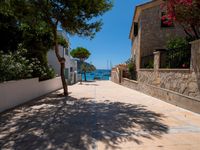 A coastal village in Mallorca, Balearic Islands, with classic architecture lining the streets. Straight down the road, the jetty extends into the clear blue ocean. The harbor is surrounded by picturesque valleys.
