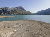 Aerial view of Mallorca, Balearic Islands, Spain. Clear sky highlights the elevated landscape with mountains, lakes, and reservoirs. Open spaces, highlands, and wilderness create a stunning natural panorama.