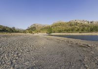 A serene coastal landscape in Mallorca, Balearic Islands. Clear sky reflects on the calm surface of the water. Small rocks dot the shoreline along the river, surrounded by breathtaking mountains.