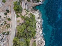 Aerial view of a straight road on the coastal landscape of Mallorca, Balearic Islands, Spain. The road stretches high above the ocean, providing a top-down perspective of the beautiful European island. Nature surrounds the asphalt road, making it a picturesque drive.