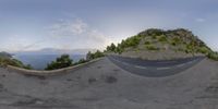 An elevated aerial view of a curved road in Mallorca, Spain. The road winds through a scenic landscape with rock formations, trees, and a clear blue sky. The Balearic Islands provide a stunning backdrop for this coastal drive.