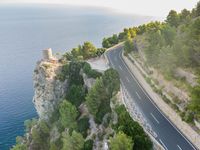 This aerial view showcases the beautiful coastal landscape of Mallorca, one of the Balearic Islands in Spain. The top-down perspective captures the elevated road that leads to the high cliffs overlooking the ocean. The asphalt road winds along the stunning coastline, providing a breathtaking view of the crystal-clear waters below. This photo represents the natural beauty of Mallorca, showcasing its unique blend of nature and architecture. From an aerial perspective, this image offers a glimpse into the diverse and captivating scenery of this European island.