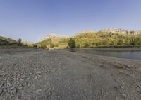 an empty lot with water and rocky surface and small tree lined land near the shore