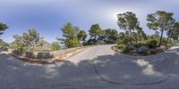 a road with trees, dirt and rocks, on a sunny day, from a fisheye