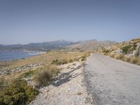 A scenic coastal road in Mallorca, Balearic Islands, Spain. The asphalt winds through stunning mountain landscapes and chaparral wilderness, with clear skies overhead. Experience the beauty of nature in Europe.