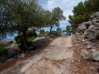 This stunning stock photo captures a beautiful road in Mallorca, Balearic Islands, Spain. Surrounded by majestic mountains, the dirt road winds through a picturesque landscape of lush nature. On one side of the road, there is a rock wall that adds a touch of charm to the scene. The clear blue sky with fluffy clouds overhead completes the perfect day for a drive. The road is covered with gravel and the surface is slightly rugged due to the presence of rocks and trees nearby. This image is a great representation of the natural beauty and serene atmosphere of Mallorca, Balearic Islands in Europe.