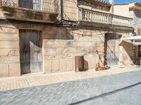 A man stands outside a classic architecture building in Mallorca, Spain. The bricked pathway leads to a road lined with charming village houses and cafes. The clear sky sets the perfect backdrop for a day of exploring the picturesque Balearic Islands.