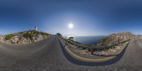 fish eye view of the road that leads to a lighthouse at the top of a cliff