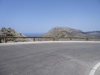 A scenic road trip along the coastal landscapes of Mallorca, Spain. The asphalt road winds through the mountains, offering breathtaking views of the ocean. Clear skies and the Armco barrier add to the charm of this European vacation destination.