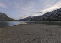 A stunning view of the Balearic Islands in Spain at dawn. The clear sky reflects on the calm waters of the lake, creating a picturesque landscape. The mountains and highlands provide a breathtaking backdrop to the tranquil open spaces.