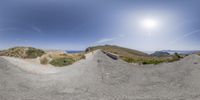 a panorama image of a long trail going up a hill and over a cliff side