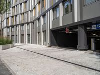 This stock photo features a man in a black jacket standing on a sidewalk in Berlin's business district. The modern architecture of the surrounding office buildings creates a striking backdrop, with parking signs and a road going through a garage area adding to the urban atmosphere. The cobblestone surface adds a touch of history to the scene. This image captures the bustling activity and contemporary aesthetic of Berlin's business district on a sunny day.