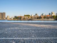 This stock photo features a man riding his bike near a city with modern architecture buildings in the background. There is a beautiful lake behind him, surrounded by nature with trees and vegetation. The image captures the vibrant city life with its cobble stone roads and open spaces. The clear sky and sunlight create a picturesque scene, highlighting the urban design of this European city. This photo represents the dynamic urban landscape of Holland, Netherlands.