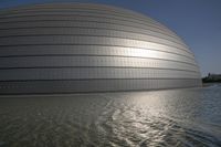 This stock photo features a man riding a skateboard in a futuristic architectural setting. The skateboarder is gliding through a cityscape with an architectural building next to a pond. The image showcases a clear sky and a calm water surface, creating a serene atmosphere. The futuristic architecture, with its metal walls and unique facade, adds a touch of modernity to the scene. The combination of the urban environment, water elements, and the skateboarder's movement brings a sense of energy and dynamism. This captivating image captures the essence of a futuristic city with its open spaces, modern structures, and blend of urban and natural elements. Perfect for illustrating concepts related to architecture, urban lifestyle, transportation, and cityscape. Shot in Beijing, China.