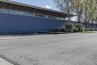 A man is riding his skateboard on the sidewalk and doing a trick down the street in Toronto, Ontario, Canada. The modern architecture of residential buildings can be seen in the background. The road surface is made of asphalt and concrete, providing a smooth path for the skateboarder. The clear sky and the shade from the trees create a pleasant atmosphere. In the distance, a factory and headquarters can be seen, showcasing the industrial and urban design of the suburb. The grey walls and gravel driveway add to the overall aesthetic of the scene.