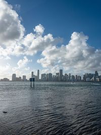 A man is standing on a beach in Miami, Florida, overlooking the iconic city skyline. In the background, there are impressive skyscrapers and a clear blue sky with fluffy clouds. The urban design perfectly merges with the coastal landscape, creating a stunning cityscape. The open space of the beach offers a peaceful retreat from the bustling city life, allowing the man to appreciate the beauty of the Miami skyline and the vast ocean water in front of him.