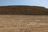a man is walking through an empty field in front of a large mound of dirt