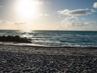 This stock photo features a man walking on the sandy shore of Miami Beach during a stunning sunset. The sun is visible in the clear sky, casting vibrant rays of sunlight. The landscape showcases the urban design of Miami with its city skyline in the background. The beach combines nature and urban life, providing a serene coastal setting. The man is holding his surfboard, ready to catch some waves in the warm ocean water. With its sunny weather and picturesque coastline, Miami Beach in Florida, USA, is the perfect destination for beach lovers.