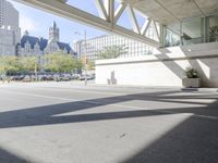 A man is seen walking down the street near a train station in the business district of Milwaukee, Wisconsin. The modern architecture of the office buildings and the road lined with asphalt create a sleek urban setting. The bridge and underpass provide infrastructure for transport. With clear blue skies and fluffy clouds, it is a beautiful day in this metropolitan area. The pedestrian is surrounded by the hard shadows cast by the buildings, highlighting the design and business elements of the city.