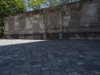 A man walking on the ground past an old wall in a city park setting with a stone floor and a stone bench. This photo captures the urban charm of Berlin, Germany, showcasing its stunning architecture and cobblestone streets. The park features lush green grass, towering trees, and a beautiful stone wall forming a courtyard. The image highlights the vibrant city life and urban design of Berlin, while the parking lot and road surface add to the overall urban atmosphere. The photo also showcases the hard shadows, creating a striking visual contrast against the brickwork and surface. This image represents the essence of Europe, particularly the Hinterhof of Berlin, and encapsulates the unique blend of history, culture, and urban charm that the city has to offer.