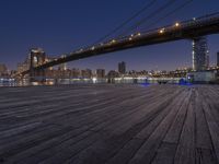 a photo of the brooklyn bridge taken from the docks at night, with lights on the bridge
