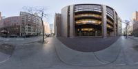 A 360-shot view of the side streets of New York City at dawn. Modern architecture dominates the skyline, with concrete buildings and glass facades. The city's bustling business district comes alive with artificial light, while open spaces provide a contrast of calm. A true urban experience in Manhattan.